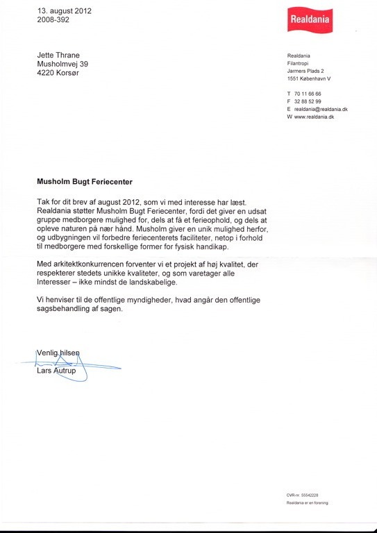 Lokalplan 1100 Musholm Bugt Feriecenter, Korsør blev taget af dagsordenen. Byrådet valgte dog at vedtage planen med tilrettelser - herunder de vi havde bedt om. Hele teksten om Svend Aukens dispensation til Centeret er kommet med, men det er ikke bare nok. Slagelse kommune vil ikke gribe ind overfor den almindelige hoteldrift man allerede har etableret og vil udbygge derude. Så er forudsætningen for den generøse dispensation efter vor mening bristet. Centeret skulle forbeholdes handicappede og ikke være for alle. Derfor indgiver vi klage over lokalplanen til Natur- og Miljøklagenævnet. Vi skrev til den nye miljøminister Ida Auken og hun forklarede os, at man var magtesløse - hvis man lejede ud til andre end handicappede. Det mener vi ikke er rigtigt. Der blev givet en dispensation på bestemte betingelser, hvis de ikke overholdes så er forudsætningerne for lokalplanen ikke opfyldt. Hvor svært kan det være?