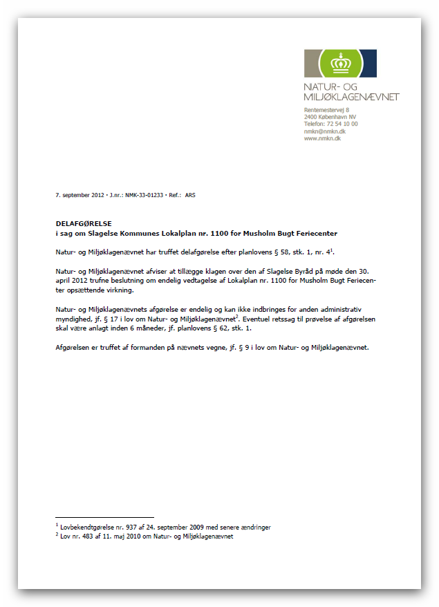 | ENDELIG FIK VI AFGØRELSE DEN KOM DEN 22. MARTS 2013 DEN IMØDEKOM IKKE VORE INDSIGELSER VI HAVDE FAKTISK PÅ INGEN MÅDE FORVENTET AT MAN VILLE GIVE OS MEDHOLD. VI KUNNE TYDELIGT SE "HVOR LANG I SPYTTET" IDA AUKEN BLEV, DA HUN FIK HOVEDSPØRGSMÅLET FORELAGT OG VI BAD OM HENDES HJÆLP I SAGEN. DEN FIK VI IKKE. IDA MÅTTE RYKKES AF OMBUDSMANDEN FOR ET SVAR OG IDA SVAREDE IKKE SELV, MEN LOD EN RESSORTMYNDIGHED SVARE. 22. marts 2013 J.nr.: NMK-33-01233 Ref.: ARS AFGØRELSE i sag om Slagelse Kommunes Lokalplan nr. 1100 for Musholm Bugt Feriecenter Natur- og Miljøklagenævnet har truffet afgørelse efter planlovens § 58, stk. 1, nr. 41. Natur- og Miljøklagenævnet kan ikke give medhold i klagen over Lokalplan nr. 1100 for Musholm Bugt Feriecenter, der blev endeligt vedtaget af Slagelse Byråd på møde den 30. april 2012. Planvedtagelsen må derfor stå ved magt.Natur- og Miljøklagenævnets afgørelse er endelig og kan ikke indbringes for anden administrativ myndighed, jf. § 17 i lov om Natur- og Miljøklagenævnet2. Eventuel retssag til prøvelse af afgørelsen skal være anlagt inden 6 måneder, jf. planlovens § 62, stk. 1. Afgørelsen er truffet af formanden på nævnets vegne, jf. § 9 i lov om Natur- og Miljøklagenævnet.