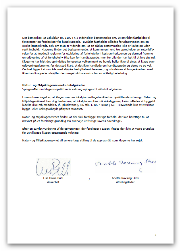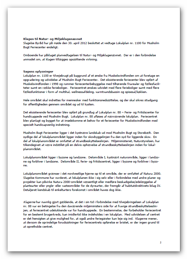 | VI ER TRE KLAGERE DER HAR DRØFTET DENNE AFGØRELSE - VI ER PÅ INGEN MÅDE TILFREDSE MED DEN. SJÆLDENT HAR VI SET EN AFGØRELSE DER I DEN GRAD FORSØGER AT ARGUMENTERE SIG UD AF PROBLEMSTILLINGERNE. FOR OS ER SAGEN ENDNU IKKE SLUT. DER STÅR TO HOVEDSPØRGSMÅL TILBAGE: VI KAN IKKE ACCEPTERE DENNE ARGUMENTATION: Lokalplanområdet grænser i det nordvestlige hjørne op til et Natura 2000-område: Habitatområde nr. 100, Centrale Storebælt og Vresen Fuglebeskyttelsesområde nr. 98, Sprogø og Halsskov Rev. Ifølge bekendtgørelse nr. 408 af 1. maj 2007 om udpegning og administration af internationale naturbeskyttelsesområder samt beskyttelse af visse arter skal der foretages en vurdering af, om projektet i sig selv, eller i forbindelse med andre planer og projekter, kan påvirke et Natura 2000-område væsentligt. Det skal samtidig vurderes, om gennemførelsen af lokalplanen kan beskadige eller ødelægge yngle- eller rasteområder i det naturlige udbredelsesområde for de dyre- og plantearter, som fremgår af habitatdirektivets bilag IV. Slagelse Kommune har vurderet, at lokalplanen ikke i sig selv eller i forbindelse med andre planer og projekter kan påvirke naturtyper eller arter i udpegningsgrundlaget for Natura 2000-området (splitterne, ederfugl og marsvin) væsentligt, og at ingen bilag IV-arter i området vil blive negativt påvirket af projektet. Kommunen har dog ikke detaljeret kendskab til enkelt arters forekomst i området. VI NOTERER OS HER, AT NÆVNET IKKE VURDERER NOGET SOM HELST SELVSTÆNDIGT, MEN LADER SLAGELSE KOMMUNES VURDERING - DER IKKE HAR NOGET DETALJERET KENDSKAB TIL TINGENE VÆRE DEN AFGØRENDE VURDERING. DEN AFGØRELSE VIL BLIVE INDBRAGT FOR EU-RETTEN. Klagerne har navnlig gjort gældende, at det i sin tid i forbindelse med tilvejebringelsen af Lokalplan nr. 88 var en betingelse fra den daværende miljøministers side for Miljøministeriets stillingtagen, at feriecentret udelukkende var for handicappede. Klagerne har imidlertid fået oplyst, at en bestemmelse, der forbeholder feriecentret for en bestemt brugerkreds, ikke kan indeholdes i en lokalplan. Med udvidelsen af centret er det således hensigten at give mulighed for, at også andre feriegæster kan leje sig ind. Klagerne mener, at dersom de oprindelige forudsætninger for feriecentrets opførelse er bristet, er der ingen grund til at opretholde centret. Det bemærkes, at Lokalplan nr. 1100 i § 3 indeholder bestemmelse om, at området fastholdes til feriecenter og ferieboliger for handicappede. Slagelse Byråd fastholder således forudsætningen om en særlig brugerkreds, selv om man er vidende om, at en sådan bestemmelse ikke er lovlig og uden reelt indhold. Klagerne finder det beskæmmende, at kommunen i ond tro opretholder en retsvildfarelse for at imødegå reglerne for etablering af feriehoteller i kystnærhedszonen og dermed fremme en udbygning af et feriehotel – ikke kun for handicappede, men for alle der har lyst til at leje sig ind. Klagerne havde hilst det oprindelige feriecenter velkomment og havde heller ikke til sinds at klage over udbygningsplanerne, før det stod klart, at det ikke handlede om handicappede og deres ve og vel. DETTE HELT AFGØRENDE SPØRGSMÅL I SAGEN VIL BLIVE INDBRAGT FOR OMBUDSMANDSINSTITUTIONEN. VI VIL SAMTIDIG BEDE OM FRI PROCES VED DOMSTOLENE. VI FINDER DET RETSSTRIDIGT AT EN PLANMYNDIGHED SOM SLAGELSE KOMMUNE, KAN INDSKRIVE BESTEMMELSER I LOKALPLANEN VIDENDE OM AT DE ER ULOVLIGE OG UDEN REELT INDHOLD. VI SER DET SOM ET FORSØG PÅ AT "SKUFFE I RETSFORHOLD" DET DER ELLERS BENÆVNES DOKUMENTFALSK. NÅR EN OFFENTLIG MYNDIGHED LADER INDGÅ BESTEMMELSER I EN LOKALPLAN FOR BEVIDST AT VILDLEDE OFFENTLIGHEDEN OM EN LOKALPLANS REELLE INDHOLD, SÅ NÆRMER DET SIG DET KRIMINELLE EFTER VOR VURDERING. HER ER DER TALE OM ET DOKUMENT - EN LOKALPLAN - MED RETSLIGE VIRKNINGER. DEN SKAL SLAGS KAN DER EFTER VOR FASTE OVERBEVISNING IKKE "FUSKES MED". ENDNU MERE BESKÆMMENDE ER DET AT NATURKLAGENÆVNET FINDER FREMGANGSMÅDEN I ORDEN. VI MÅ SPØRGE OS SELV: "Hvordan kan en lokalplan være lovligt vedtaget, når den indeholder bestemmelser der er ulovlige?" NMK-33-01233.pdf foreløbig afgørelse