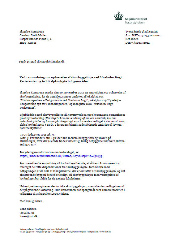 http://www.tv2east.dk/artikler/millionbyggeri-ved-feriecenter-paa-kant-med-loven Den 7. marts 2014 fik vor Natur- og miljøgruppe tilsendt en kopi af en dispensation fra skovbyggelinjen. Afsenderen kunne af indholdet se, at denne afgørelse givet måtte have vor interesse og fandt det for groft, at kommunen ikke havde offentliggjort den. Så fik vi travlt, med at få indsamlet oplysninger og med at få stablet en klage på benene. På vor ordinære generalforsamling den 22. marts 2014 fik vi godkendt, at vi forfulgte sagen og internt i bestyrelsen blev det aftalt, at denne sag blev kørt af 3 fra Natur- og miljø gruppen, hvoraf de 2 havde fast ejendom i det berørte område. Det blev også aftalt, hvem der stod for pressedækningen - således, at vor forenings nyvalgte formand ikke skulle løbe spidsrod i en sådan sag, der kræver at man kender den komplicerede lovgivning på fingerene. I sagen her har den gamle formand været skriverkarl - eller rettere tekstforfatter, mens Per har stået for kontakterne til myndighederne i form af mails og telefonsamtaler samt pressedækningen. VI har holdt møder om sagen og har daglig været i telefonisk kontakt og det har ofte været i de sene nattetimer. Per og jeg arbejder fantastisk godt sammen og jeg glæder mig over Pers fantastiske drive og Per er til gengæld glad for min juridiske ekspertise og min årelange erfaring. Vi ved, at man fra kommunens side vil gøre alt for at bremse os. Man forsøger at bilde Naturklagenævnet ind, at vi ikke er klageberettigede og at skoven ikke er beliggende i vort virkeområde. Det holder ikke en meter og det er jo trist, at vi har medlemmer der er naboer til skoven.